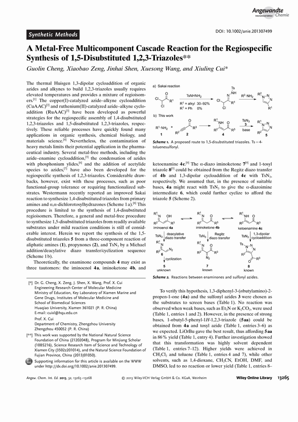 我工程中心海洋药物平台崔秀灵教授团队日前在国际顶尖化学刊物Angewandte Chemie International Edition上发表了题为《A Metal-free Multicomponent Cascade Reaction for the Regiospecific Synthesis of 1,5-Disubstituted 1,2,3-Triazoles》的研究论文(Angew Chem Int Ed, 2013 50 13265)。
